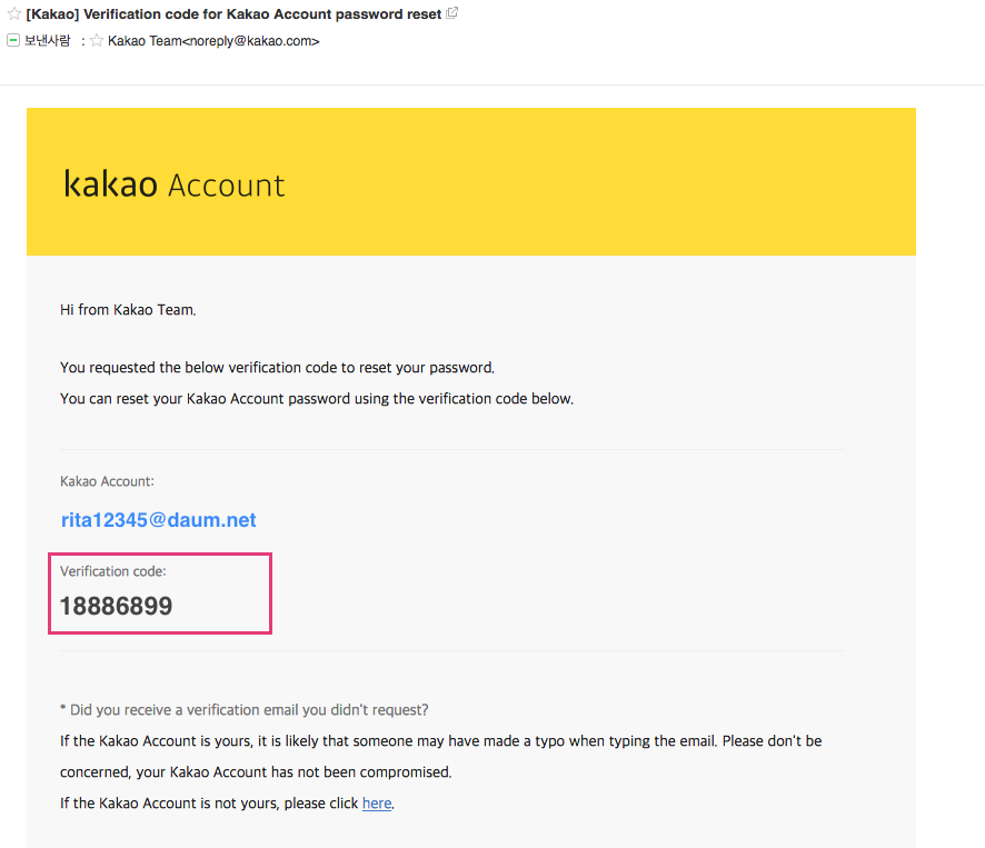 为了保护您的 Kakao 帐户,您需要在密码重置过程中验证用于 Kakao 帐户的电子邮件地址以及用户身份验证。如果您无法通过电子邮件验证或通过用户身份验证,则无法重置密码。